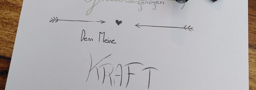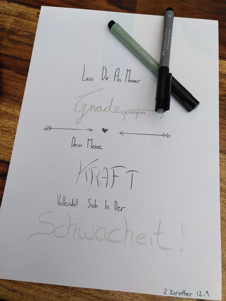 Ich liebe es, Verse, die mir ins Herz sprechen selbst zu schreiben und zu gestalten. Oft würde ich gerne noch viel mehr drum herum malen und „verschönern“, doch meistens liegt in der Schlichtheit der Worte für mich deren tiefe Bedeutung. Es ist so gut für meine Seele zu wissen, dass Jesus in meiner Schwachheit ist und sich dort breit macht. Ja sie sogar nutzt um seine ganze Kraft zu entfalten. „Denn wenn ich schwach bin, so bin ich stark“, schreibt Paulus etwas später im selben Kapitel. Weil er zulässt, dass Jesus in seine Schwäche kommt und ihn in aller Not, Verzweiflung, Verfolgung und seinen Schmerzen gnädig bei sich aufnimmt.